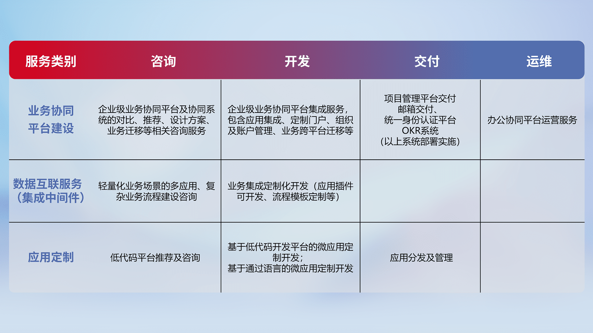 针对钉钉、、、、企微、、、、IDaas等平台级产品提供产品的规划、、、方案、、、交付、、、定制化开发等服务,,实现如统一协同办公、、、、智能客户服务、、混合会议管理、、、、智能数据查询、、等业务场景,,,实现数字化转型。。。。